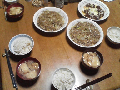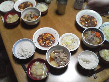今日は肉じゃがなどを頂きます。普通の肉じゃが・・麻婆豆腐も頂きます。味噌汁はキャベツとあぶらげ・・キャベツサラダも頂きます。今日もおいしく頂きました。