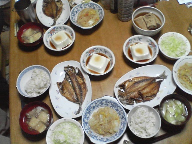 今日は鯵などを頂きます。フライパンにオリーブ油を入れ、鯵の開きを焼きます。完成。春雨と白菜の炒め物?凍み豆腐の煮物も頂きます。普通の豆腐も・・味噌汁は長葱とシメジ・・今日もおいしく頂きました。