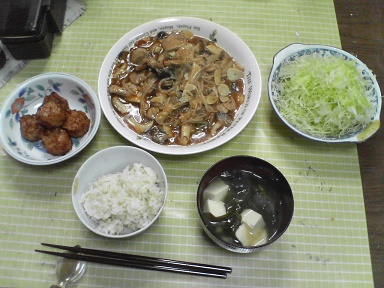 今日はあんかけ野菜炒めなどを頂きます。フライパンにオリーブ油を入れ、玉葱、舞茸、エノキなどを炒めます。モヤシとキャベツを加え、火が通ったら、中華ダシ、オイスターソース、醤油などで味付けし、あんかけの素を加えます。完成。肉団子にチーズを乗せて電子レンジで加熱します。こちらも完成。味噌汁はモヤシとあぶらげ・・今日もおいしく頂きました。
