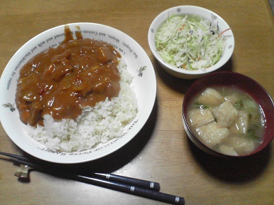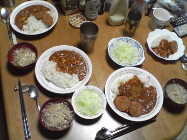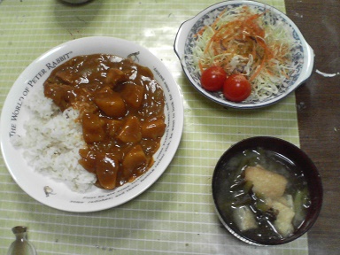 今日はカレーなどを頂きます。普通のポークカレー・・味噌汁は小松菜とあぶらげ・・、サラダも頂きます。今日もおいしく頂きました。