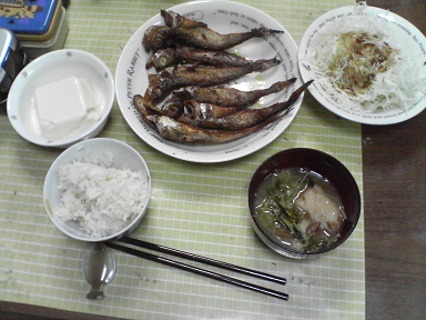 今日はハタハタなどを頂きます。フライパンにオリーブ油を入れハタハタを焼きます。じっくり焼いて完成。豆腐も頂きます。味噌汁は豆苗・・今日もおいしく頂きました。