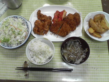 今日は揚物などを頂きます。鶏唐揚、一口カツ、カニカマ揚げも・・定番のポテトフライ・・味噌汁はモヤシと舞茸・・キャベツサラダも頂きます。今日もおいしく頂きました。