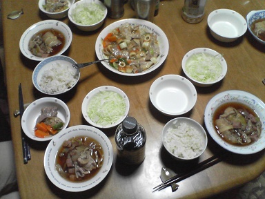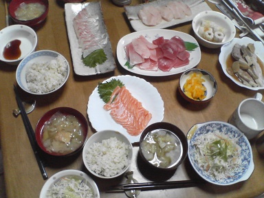 明けましておめでとうございます。本年もよろしくお願いいたします。今日は刺身などを頂きます。お節料理は省略・・刺身各種・・豚肉も頂きます。自家製の煮豚?おつまみ?味噌汁はネギと揚げ豆腐・・キャベツサラダも頂きます。今日もおいしく頂きました。