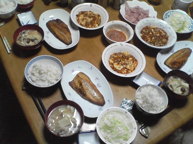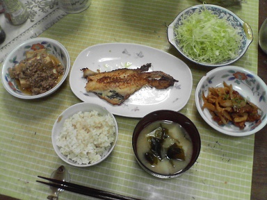今日は鯖などを頂きます。フライパンにオリーブ油を入れ塩鯖を焼きます。じっくり焼いて完成。麻婆豆腐・・刺身も頂きます。塩辛も・・味噌汁はシメジと揚げ豆腐・・キャベツサラダも頂きます。今日もおいしく頂きました。