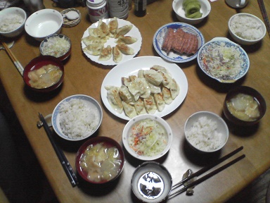 今日は餃子などを頂きます。フライパンにオリーブ油を入れ餃子を焼きます。完成。ハム? ソーセージ?味噌汁は白菜とあぶらげ・・キャベツサラダも頂きます。キウイも・・今日もおいしく頂きました。