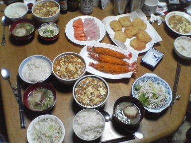 今日は麻婆豆腐などを頂きます。普通の麻婆豆腐・・刺身・・エビフライも頂きます。白身フライ?味噌汁は豆苗といエノキとあぶらげ・・キャベツサラダも頂きます。今日もおいしく頂きました。