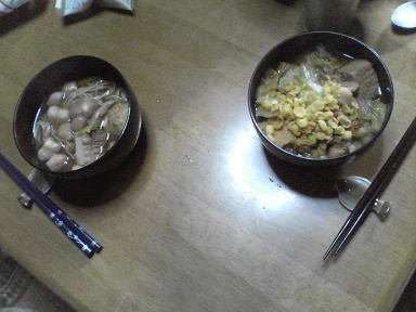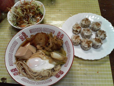 今日はうどんなどを頂きます。鍋にダシを入れ、舞茸、長葱、モヤシ、豆腐などを煮込みます。うどんを入れて少々煮込んで完成。完成。細めのうどん・・焼売・・キャベツサラダも頂きます。今日もおいしく頂きました。