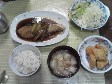 今日はブリなどを頂きます。ブリの照り煮・・蒲鉾も頂きます。味噌汁は豆麩・・サラダも頂きます。今日もおいしく頂きました。