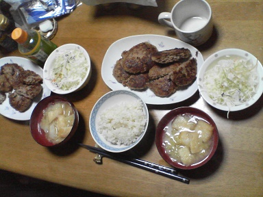 今日はハンバーグなどを頂きます。フライパンにオリーブ油を入れハンバーグを焼きます。完成。味噌汁はキャベツとあぶらげ・・キャベツサラダも頂きます。今日もおいしく頂きました。