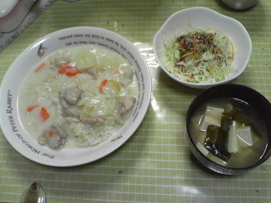今日はシチューなどを頂きます。普通のシチュー・・味噌汁は豆腐とワカメ・・キャベツサラダも頂きます。今日もおいしく頂きました。