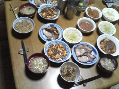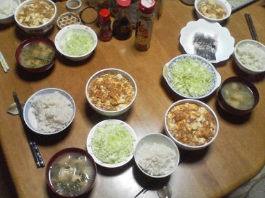 今日は麻婆豆腐などを頂きます。四川風麻婆豆腐?花山椒をトッピング・・豚肉も頂きます。コロッケも・・今日は炊込み御飯、塩辛も頂きます。味噌汁はモヤシと卵・・キャベツサラダも頂きます。今日もおいしく頂きました。