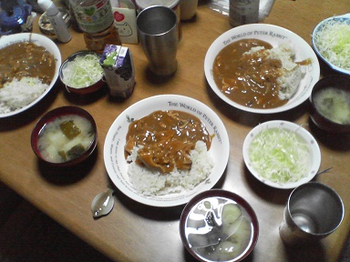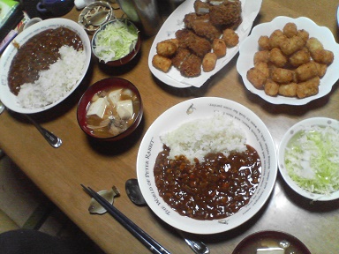 今日はカレーと揚物などを頂きます。キーマカレー・・揚物も頂きます。味噌汁は鍋物の余りを流用・・キャベツサラダも頂きます。今日もおいしく頂きました。