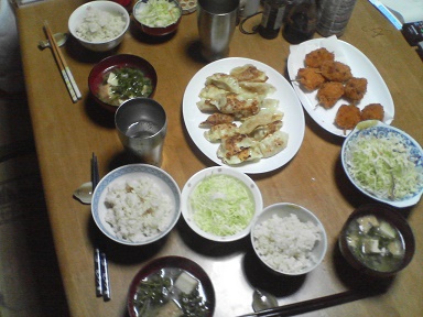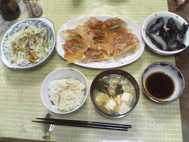 今日は餃子などを頂きます。フライパンにオリーブ油を入れ餃子を焼きます。完成。羽付き餃子・・茄子漬けも頂きます。味噌汁は豆腐とワカメ・・キャベツサラダも頂きます。今日もおいしく頂きました。