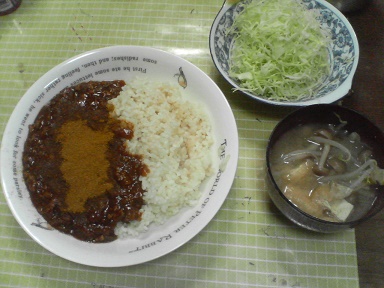 今日はカレーなどを頂きます。ポークカレー・・ガラムマサラで強化?味噌汁はモヤシとシメジとあぶらげ・・キャベツサラダも頂きます。今日もおいしく頂きました。