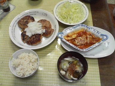 今日はハンバーグなどを頂きます。大根おろしとポン酢で頂きます。ポテトのチーズ掛けも・・味噌汁は豆腐とワカメとネギ・・キャベツサラダも頂きます。今日もおいしく頂きました。