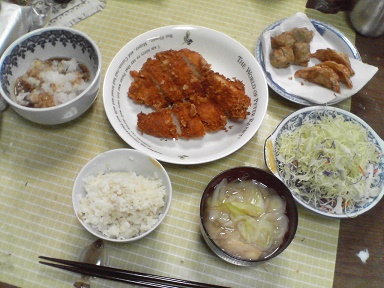 今日はカツなどを頂きます。とりあえずヒレカツ・・今日も大根おろしタレ?ついでに揚げた餃子と焼売・・味噌汁はモヤシとネギ・・キャベツサラダも頂きます。今日もおいしく頂きました。