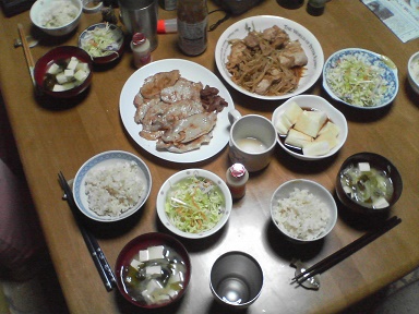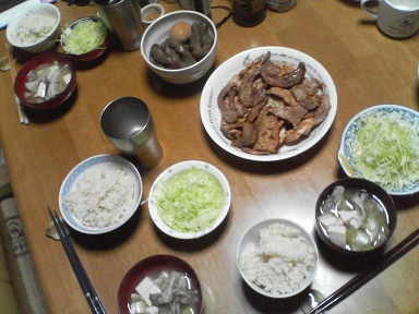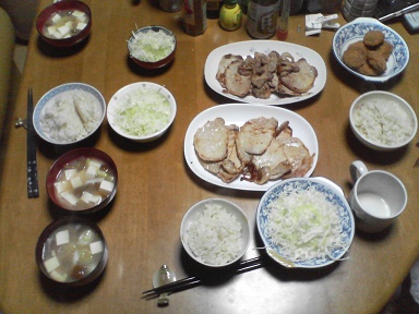 今日は豚肉などを頂きます。フライパンにオリーブ油を入れ豚肉を焼きます。完成。モヤシ炒めも頂きます。山芋も・・味噌汁は豆腐とワカメ・・キャベツサラダも頂きます。今日もおいしく頂きました。