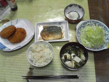今日は鯖などを頂きます。鯖の味噌煮、レトルト品・・コロッケも頂きます。温泉玉子も・・味噌汁は豆腐とワカメ・・キャベツサラダも頂きます。今日もおいしく頂きました。