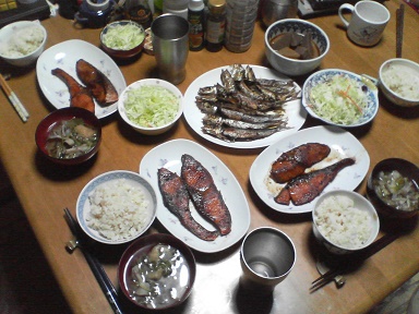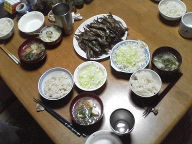 今日はシシャモなどを頂きます。フライパンにオリーブ油を入れシシャモを焼きます。じっくり焼いて完成。味噌汁は豆苗と揚げ豆腐・・キャベツサラダも頂きます。今日もおいしく頂きました。