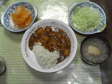 今日はカレーなどを頂きます。定番のポークカレー・・味噌汁はモヤシとあぶらげ・・キャベツサラダも頂きます。グレープフルーツも・・今日もおいしく頂きました。