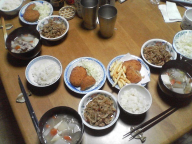 今日は揚物などを頂きます。コロッケとポテト・・ゴボウ炒めも頂きます。味噌汁は豚汁風・・キャベツサラダも頂きます。今日もおいしく頂きました。