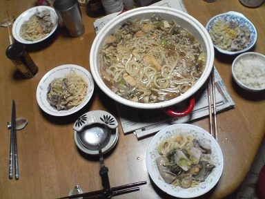 今日は鍋ラーメンなどを頂きます。材料は長葱、モヤシ、豆苗、豚肉、舞茸、シメジ、エノキ、などなど。ラーメンとうどんも・・今日もおいしく頂きました。
