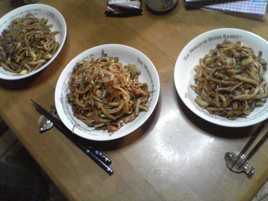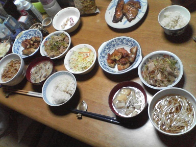 今日は鶏などを頂きます。フライパンにオリーブ油を入れ鶏肉を焼きます。完成。魚も焼きます。名称不明?完成。ビーフンも頂きます。なぜかそうめんも?味噌汁はエノキとあぶらげ・・キャベツサラダも頂きます。今日もおいしく頂きました。