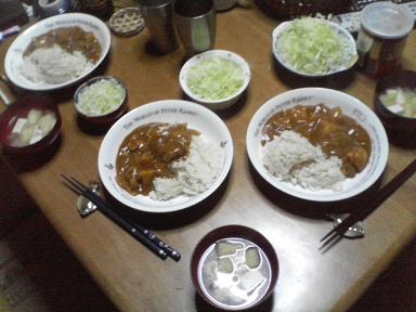 今日はカレーなどを頂きます。普通のポークカレー?味噌汁はジャガイモとワカメ・・キャベツサラダも頂きます。今日もおいしく頂きました。