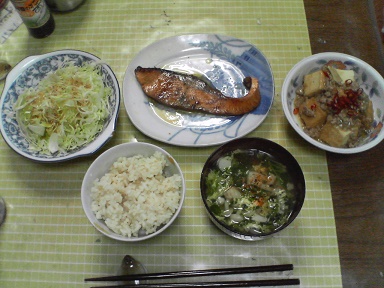 今日は麻婆豆腐などを頂きます。フライパンにオリーブ油を入れ挽肉、玉葱、長葱などを炒めます。ついでにエノキとシメジが余っていたので入れてみました。火が通ったら中華ダシ、オイスターソース、醤油、ガーリック、豆板醤、胡麻油などで味付けし、水に溶いた片栗粉でとろみをつけ、豆腐を加えて混ぜ合わせます。完成。〆鯖が余っていたので頂きます。味噌汁は豆苗とあぶらげ・・キャベツサラダも頂きます。今日もおいしく頂きました。