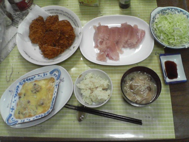 今日は刺身などを頂きます。刺身を頂きます。マグロ・・カツも頂きます。グラタンも・・味噌汁はシメジとエノキ・・キャベツサラダも頂きます。今日もおいしく頂きました。