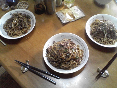 今日は焼うどんなどを頂きます。フライパンにオリーブ油を入れ豚肉、モヤシ、キャベツなどを炒めます。火が通ったらうどんとソースを加えて混ぜ合わせます。完成。今日もおいしく頂きました。