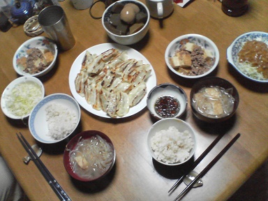 今日は餃子などを頂きます。フライパンにオリーブ油を入れ餃子を焼きます。完成。肉豆腐も頂きます。蒟蒻とゆでたまご・・味噌汁はモヤシとあぶらげ、キャベツサラダも頂きます。今日もおいしく頂きました。