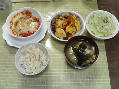 今日はあんかけ卵などを頂きます。あんかけ卵・・マカロニにミートソースとチーズを乗せたもの?味噌汁は豆腐とワカメ・・キャベツサラダも頂きます。今日もおいしく頂きました。