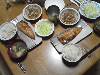 今日は鯖などを頂きます。フライパンにオリーブ油を入れ、鯖を焼きます。完成。モヤシ炒めも頂きます。味噌汁は豆苗とあぶらげ・・キャベツサラダも頂きます。今日もおいしく頂きました。