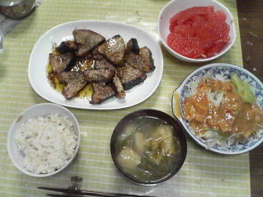 今日はjカツオのオリーブ油焼きなどを頂きます。フライパンにオリーブ油を入れタタキ用のカツオを焼きます。スライスニンニク、オイスターソース、醤油、コショーなどで味付けして完成。味噌汁は水菜とあぶらげ・・キャベツサラダも頂きます。ドレッシング大盛り?グレープフルーツも・・今日もおいしく頂きました。