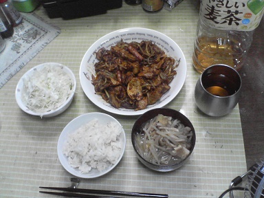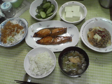 今日はブリなどを頂きます。フライパンにオリーブ油を入れ、ブリを焼きます。味醂漬け?完成。肉豆腐も頂きます。冷奴も・・味噌汁はキャベツと舞茸とあぶらげ・・胡瓜・・キャベツサラダも頂きます。今日もおいしく頂きました。