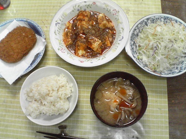 今日は麻婆豆腐などを頂きます。四川風麻婆豆腐?コロッケも頂きます。味噌汁はシメジとあぶらげ、ラー油をかけてみました。キャベツサラダも頂きます。今日もおいしく頂きました。
