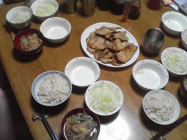今日は豚肉などを頂きます。フライパンにオリーブ油を入れ、豚肉を焼きます。素焼き・・完成。各自好みのタレで頂きます。味噌汁はモヤシとあぶらげ・・キャベツサラダも頂きます。今日もおいしく頂きました。
