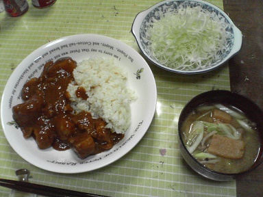 今日はカレーなどを頂きます。ポークカレー・・味噌汁はシメジとネギとあぶらげ・・キャベツサラダも頂きます。今日もおいしく頂きました。