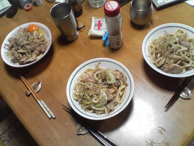 今日は焼うどんなどを頂きます。フライパンにオリーブ油を入れ、豚肉、舞茸、ピーマン、長葱などを炒めます。火が通ったら、キャベツ半玉とモヤシ1kgを加えます。うどん6玉を加え、醤油、味醂、和風だしなどで味付けします。完成、生卵をトッピング・・今日もおいしく頂きました。