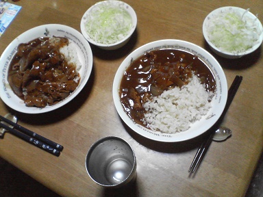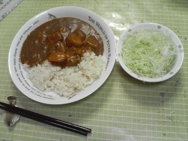 今日はカレーなどを頂きます。普通のポークカレー・・キャベツサラダも頂きます。今日もおいしく頂きました。