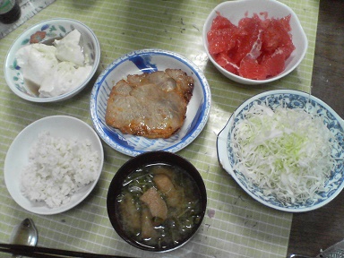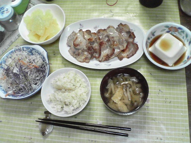今日は豚肉などを頂きます。素焼きの豚肉、おろしニンニクと醤油で頂きます。豆腐も頂きます。味噌汁はシメジとあぶらげ・・キャベツサラダも頂きます。グレープフルーツも・・今日もおいしく頂きました。