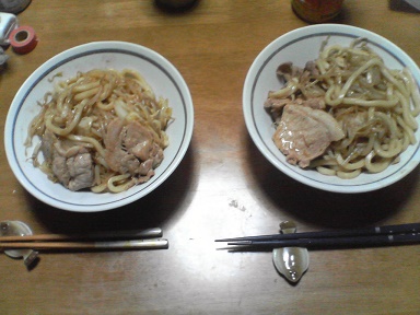 今日は焼うどんなどを頂きます。フライパンにオリーブ油を入れ、豚肉から炒めます。キャベツ半玉分を加えます。モヤシ1kgと和風だし、オイスターソースなどを加えます。うどん6玉とダシ醤油を加えて混ぜ合わせます。完成。今日もおいしく頂きました。