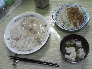 今日はシチューなどを頂きます。普通のシチュー、御飯にかけて頂きます。味噌汁は豆腐とワカメ・・キャベツサラダも頂きます。今日もおいしく頂きました。