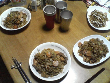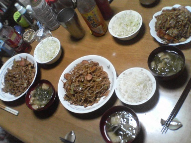 今日は焼きそばなどを頂きます。モヤシ、キャベツ、長葱、エリンギ、シメジ、ソーセージなどを用意・・フライパンにオリーブ油を入れ、キノコ類から炒めます。火が通ったら、モヤシとキャベツを加えます。ソーセージと麺とソースを加えて混ぜ合わせます。完成。味噌汁は水菜と長葱とあぶらげ・・キャベツサラダも頂きます。今日もおいしく頂きました。