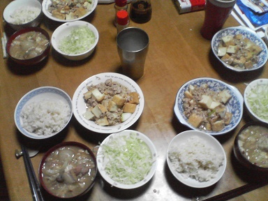今日は肉豆腐などを頂きます。フライパンにオリーブ油を入れ、豚挽肉を炒めます。火が通ったら、長葱、エノキ、揚豆腐などを加え炒めます。ダシ醤油、味醂、砂糖などで味付けし、片栗粉でとろみをつけます。完成。味噌汁代わりに昨日の鍋物の余りを流用・・キャベツサラダも頂きます。今日もおいしく頂きました。