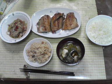 今日はホッケなどを頂きます。フライパンにオリーブ油を入れ、ホッケを焼きます。完成。モヤシ炒めも頂きます。今日は炊込み御飯、味噌汁は豆腐とワカメ・・キャベツサラダも頂きます。今日もおいしく頂きました。