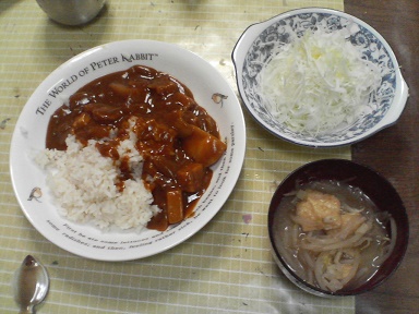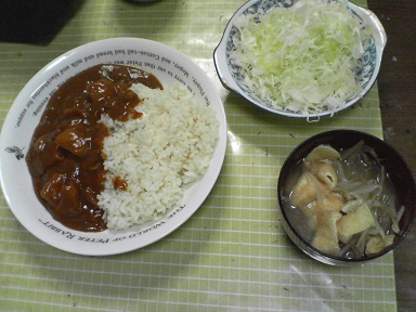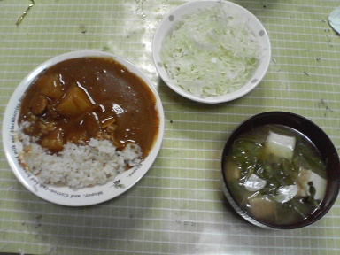 今日はカレーなどを頂きます。普通のポークカレー・・味噌汁はモヤシとあぶらげ・・キャベツサラダも頂きます。今日もおいしく頂きました。