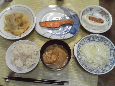 今日はシャケなどを頂きます。シャケのオリーブ油焼き・・ジャガイモと玉葱とベーコンの炒め物?豆腐も頂きます。味噌汁は大根とあぶらげ・・キャベツサラダも頂きます。今日もおいしく頂きました。