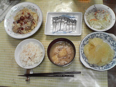 今日は〆鯖などを頂きます。普通の〆鯖?ビーフンも頂きます。味噌汁はエノキとあぶらげ・・キャベツサラダも頂きます。グレープフルーツも・・今日もおいしく頂きました。